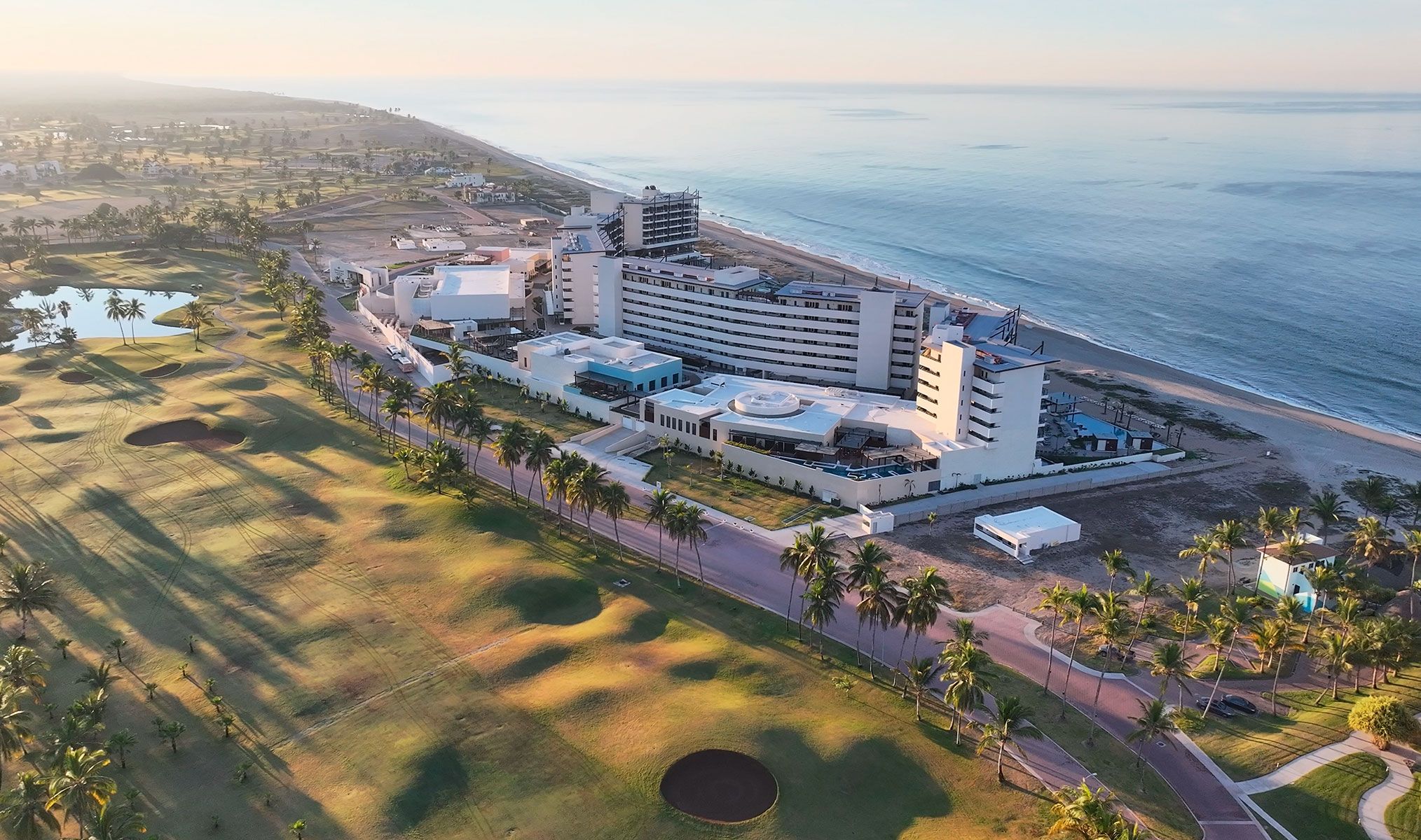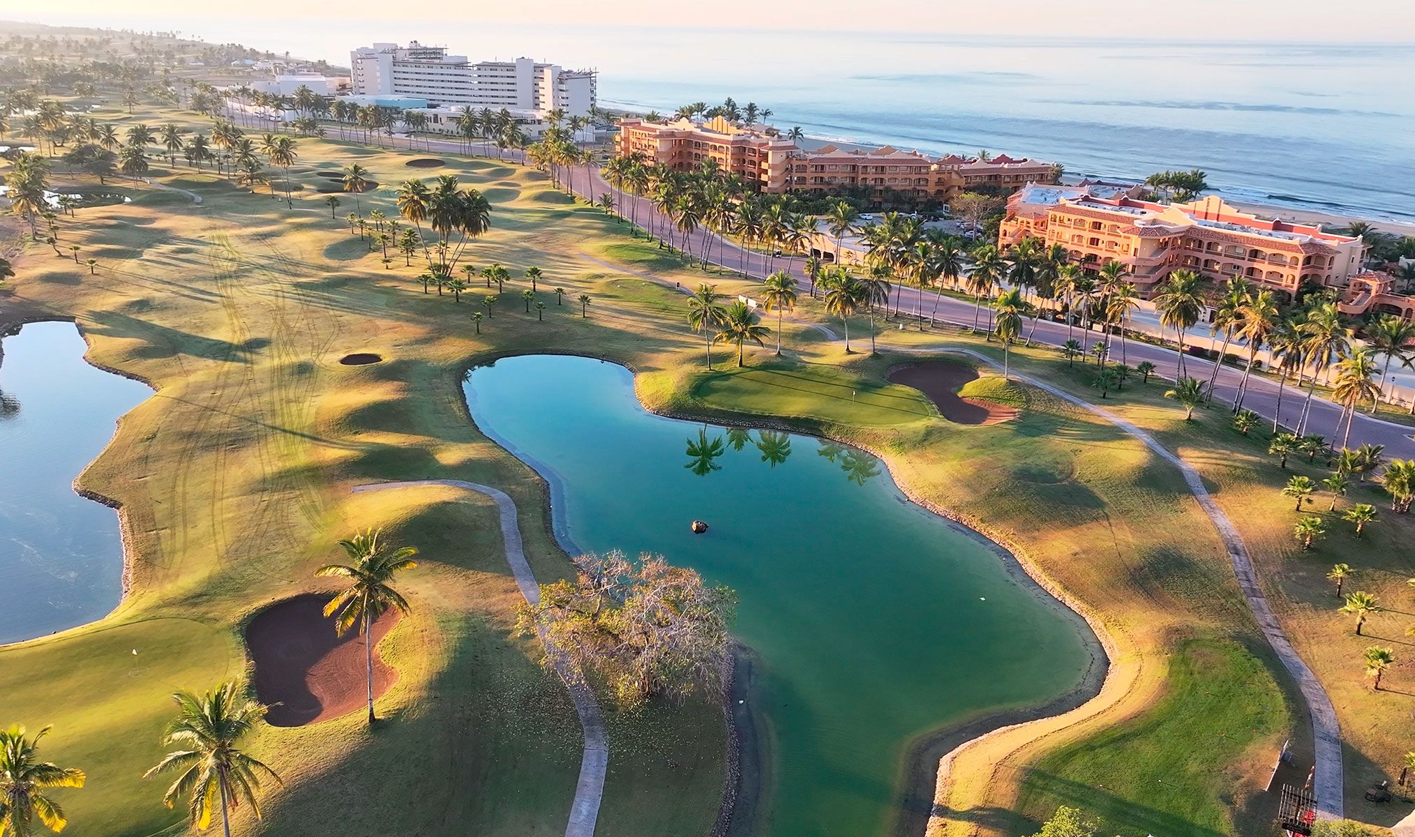 El diseño se extiende sobre 178 acres con grandes bunkers y 11 lagos que recorren el campo de golf, bordeados de palmeras y vegetación nativa, y 6 hoyos abrazando el mar.